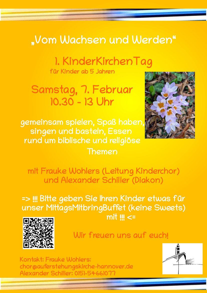 damit wir ein großes Mitbringbuffet aufbauen können. Nach einem gemeinsamen Abschlusskreis um 13 Uhr werden die Kinder, die nicht am Kinderchor teilnehmen, abgeholt und die Schulkinder des Kinderchors treffen sich im Anschluss zu den Kinder-Kirchentagen zu einer erweiterten Probe bis 15 Uhr.