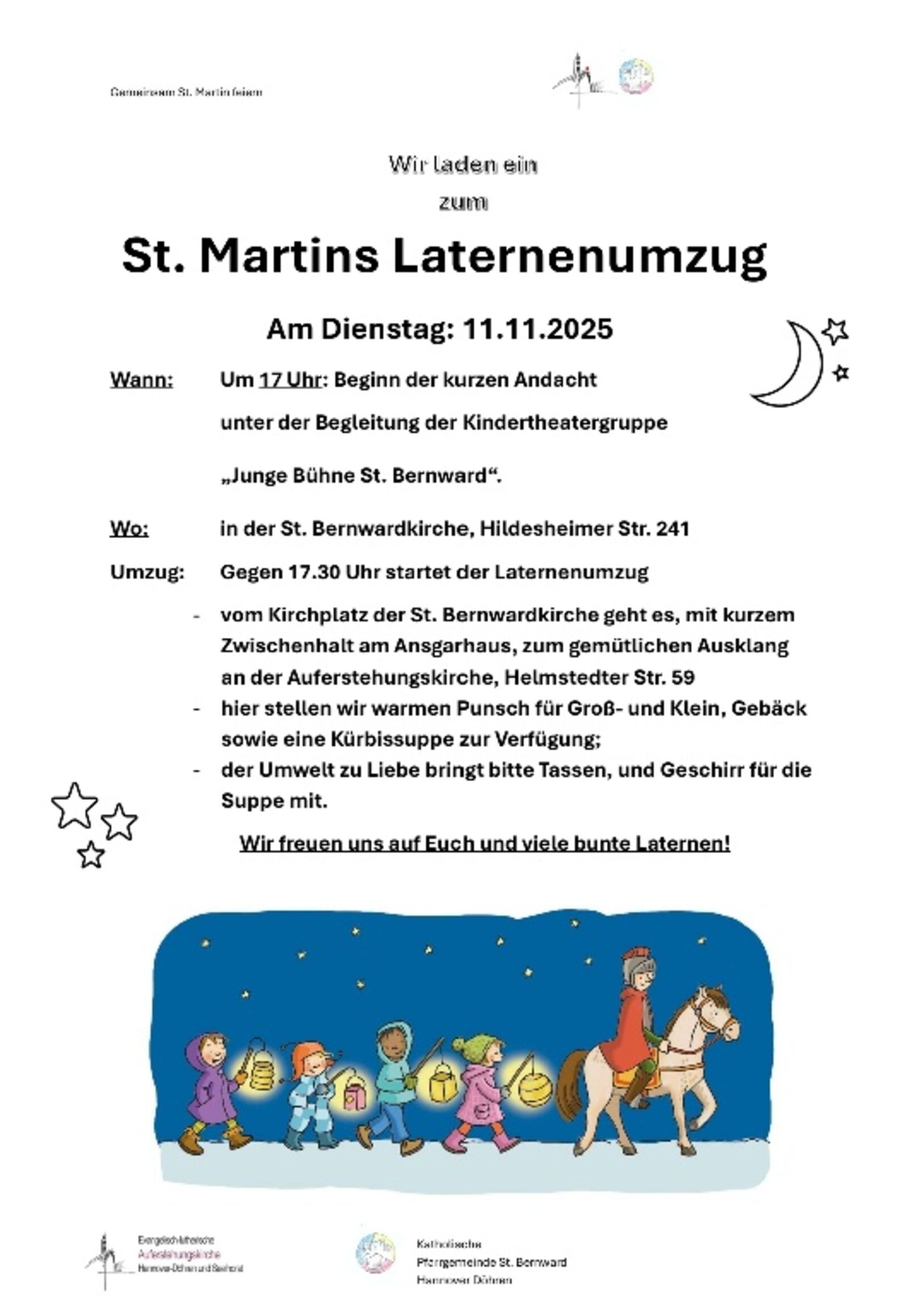 Am Dienstag, 11. November, 17 Uhr starten wir in der katholischen St. Bernward-Kirche (Hildesheimer Straße 241) mit einer kurzen Andacht mit Martinsspiel.